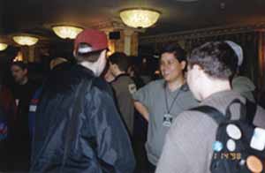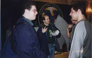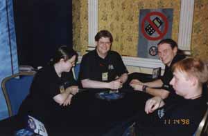 Brian Hacker, Ellen Koberer, and Michael Sochon chat between rounds